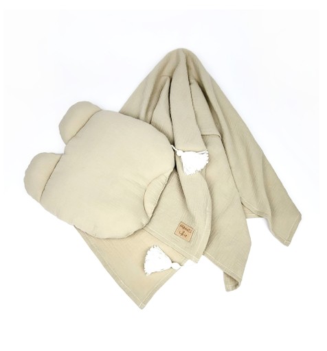 Zestaw składa się z kocyka, oraz podusi w kształcie misia. Kocyk jak i poduszka wykonane są w 100% z najwyższej jakości bawełny muślinowej. Dzięki miłej w dotyku gramaturze idealnie nadaje się dla dziecka do wózeczków, kołysek, łóżeczek niemowląt.