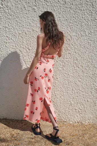 SPÓDNICA Z TKANINY Z DOMIESZKĄ LNU 40% i 60%WISKOZA. WYSOKI STAN. ROZCIĘCIE U DOŁU Z TYŁU. ZAPIĘCIE NA SUWAK.KOLOR KORALOWY Z NADRUKIEM W KWIATY,ROZMIAR PASUJE NA S.