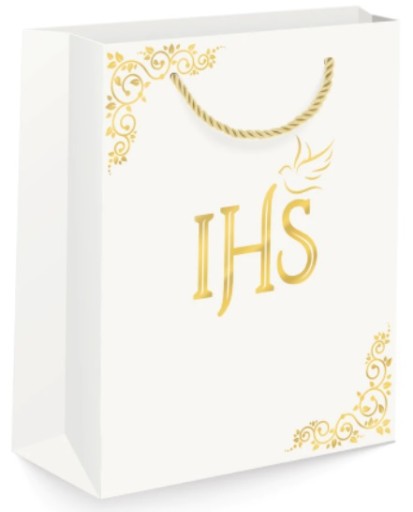 Torebka na prezenty na Komunię Świętą z uchwytem oraz napisem "IHS" i gołąbkiem