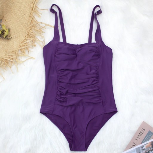Kostium posiada marszczenia umiejscowione w taki sposób aby optycznie wymodelować sylwetkę.