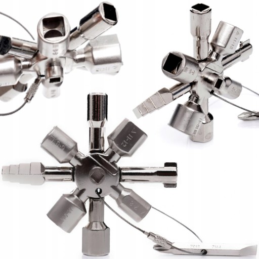 ✅ Uniwersalny klucz do szafek sterujących posiadający 10 różnych końcówek.