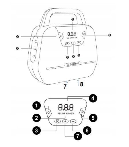 Podłącz kompresor do zasilania, ustaw przyciskami "+" oraz "-" zadaną wartość ciśnienia, przyciskiem M możesz zmienić jednostkę (PSI / BAR / KPA / KG/CM3) - włącz działanie kompresora przyciskiem z prawej strony.