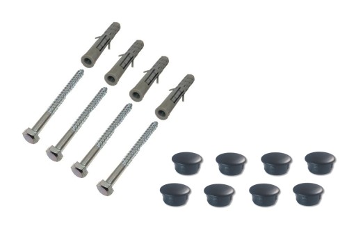 W zestawie 4szt wkręty z kołkami do przymocowania do ściany oraz 8szt czarnych zaślepek do zaślepienia wszystkich otworów montażowych.