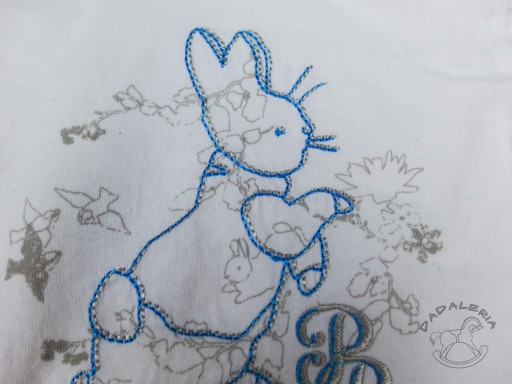 Bluzeczka Peter Rabbit wykonana z mięsistej bawełny. Na ramieniu wygodne zapięcie na dwa guziczki. Z przodu nadruk uzupełniony haftem w kolorze szarości i błękitu. W tych samych barwach wykonano przeszycie mankietów, dekoltu i dołu koszulki.