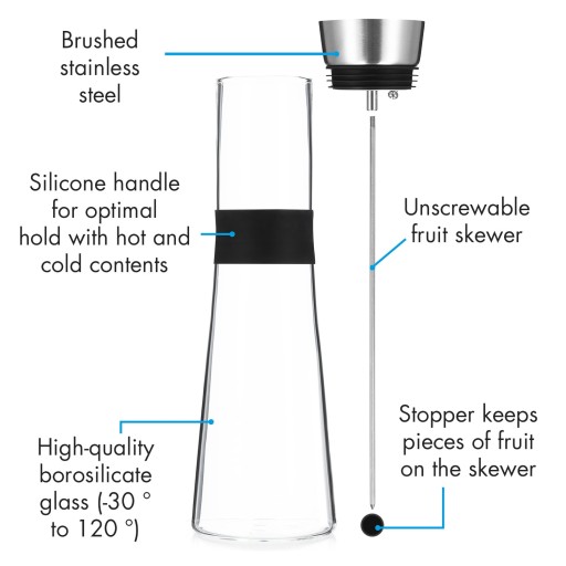 Elegancka szklana karafka zachwyca nie tylko wyjątkowo atrakcyjnym wyglądem, ale ma również wyjmowany szpikulec na owoce. Po prostu wkręć szpikulec w gwint w pokrywce ze stali nierdzewnej, nabij ulubione owoce i załóż praktyczny stoper. Kawałki owoców nadadzą wodzie świeży i pyszny smak, nie zatykając karafki podczas nalewania. Oczywiście szpikulec można również wyjąć, aby użyć dzbanka do podania gorącej herbaty lub zimnego soku. Nie stanowi to problemu ze względu na wykończenie karafki ze szkła borokrzemowego, które jest wyjątkowo odporne na działanie wysokiej i niskiej temperatury ze względu na wysoką zawartość boru. Pewne trzymanie w dłoni zapewnia również antypoślizgowy silikonowy pierścień, chroniący ręce podczas serwowania gorących i zimnych napojów.