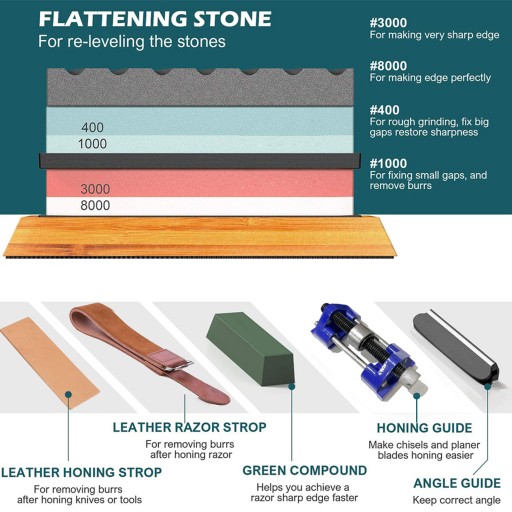 Ten kompletny zestaw do ostrzenia noży jest dostarczany z dwustronną (400 # / 1000 # 3000 # / 8000 #) wysokiej jakości osełką, antypoślizgową podstawą do trzymania kamienia i prowadnicą kątową ostrzenia noża itp.