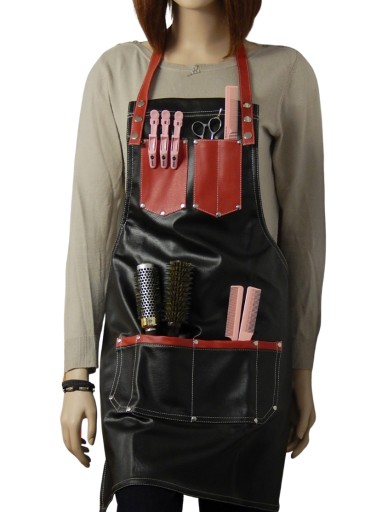 Elegancki fartuch fryzjerski/barberski wykonany z wytrzymałej a zarazem przykuwającej wzrok ekoskóry w kolorze czarnym z czerwonymi wstawkami.