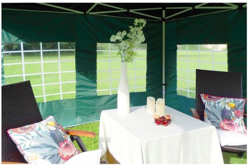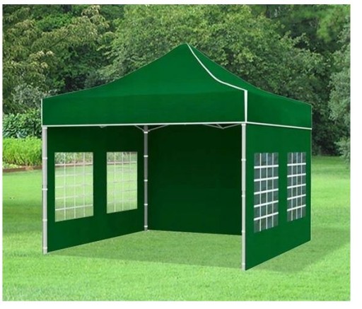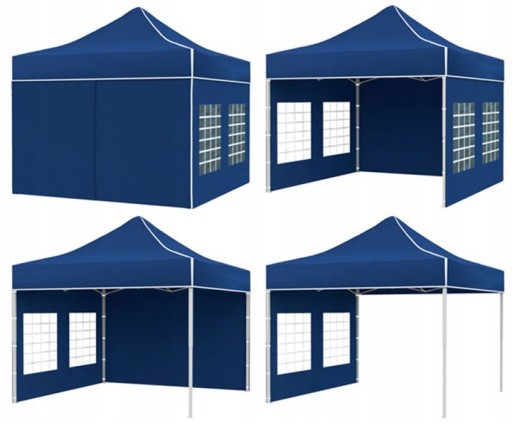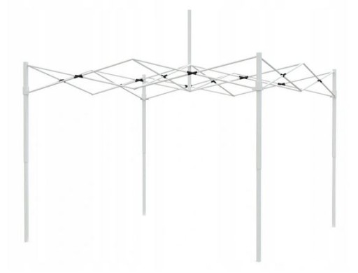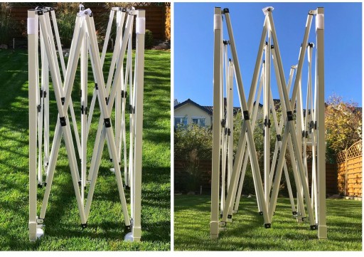 Składany pawilon ma teleskopowe nogi o regulowanej wysokości, które osiągają wysokość boczną ok. 2,30 m na najwyższym poziomie.