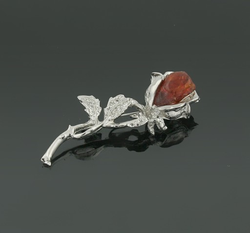 Piękna broszka róża ozdobiona naturalnym bursztynem.