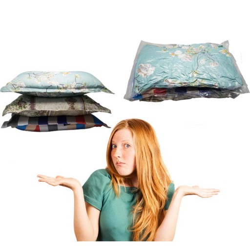 Jak działa worek próżniowy na pościel? Wystarczy włożyć do niego kołdrę, odzież lub zabawki; zamknąć strunę za pomocą klipsów; wyssać powietrze za pomocą odkurzacza lub specjalnej pompki ( przenośna pompka dostępna na innej aukcji)