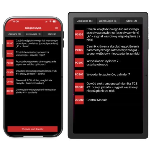 - Odczyt kodów błędów ogólnych i charakterystycznych producenta