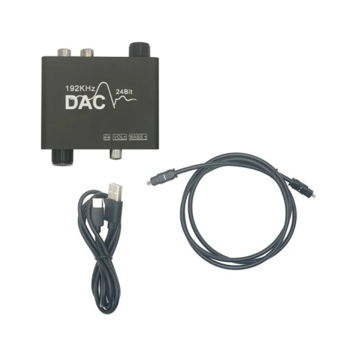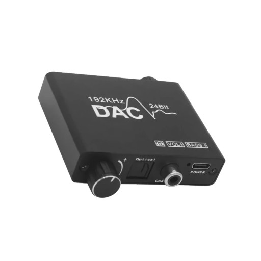 DAC 192KHZ jest urządzeniem, które konwertuje sygnał audio z cyfrowego na analogowy. Konwerter umożliwia konwersję sygnału z cyfrowego złącza Toslink lub coaxial na analogowe 2x Cinch lub JACK. Urządzenie wyposażone zostało w reduktor szumu, dzięki czemu jakość dźwięku jest jeszcze lepsza. Współpracuje ze słuchawkami pracującymi w zakresie 32 ~ 600Ω. Wyposażony w dwa pokrętła, do regulacji basów oraz regulacji głośności.