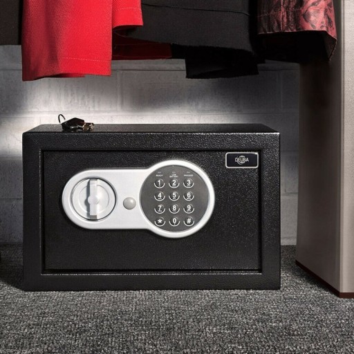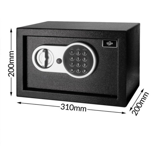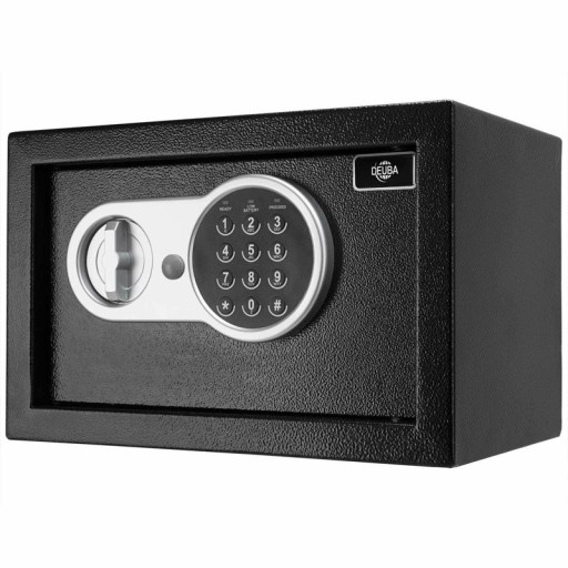 Solidny sejf o grubości drzwi 3,2 mm, wyświetlacz LED, drzwi stalowe z podwójną ryglą i programowalnym elektrycznie zamkiem szyfrowym.