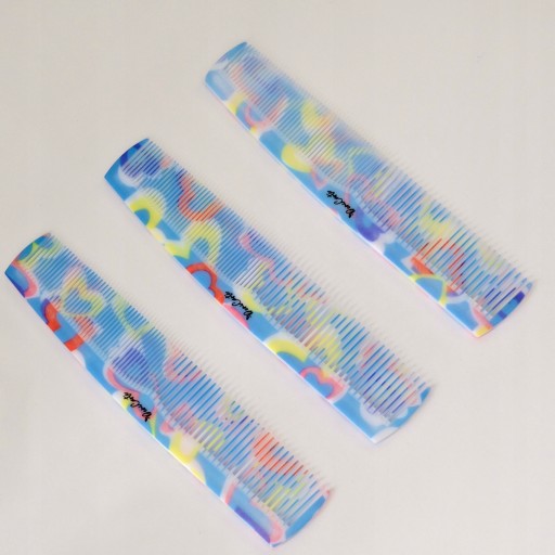 Prosty grzebień wykonany z wysokiej jakości tworzywa z fantazyjnym kolorowym wykończeniem.