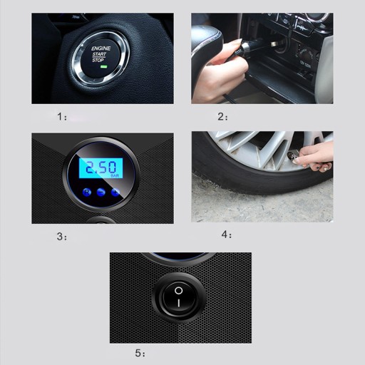 Dzięki temu pompowanie niskich i przebitych opon w sytuacjach awaryjnych jest łatwiejsze i wygodniejsze. Manometr Wyświetlacz sprężarki powietrza: PSI, BAR, KPA, KGF/CM2.