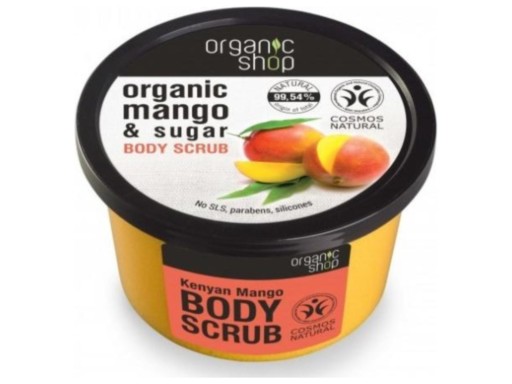 Producent Eurobiolab, marka Organic Shop to kosmetyki na bazie ziół do stosowania w codziennej pielęgnacji. Zawierający 99,54% składników naturalnych rozświetlający peeling do ciała na bazie organicznego ekstraktu z mango i naturalnego cukru. Delikatnie oczyszcza i regeneruje skórę sprawiając, że staje się ona miękka, jedwabiście gładka i zyskuje zdrowy wygląd. Organiczny ekstrakt z owoców mango wspiera naturalne bariery ochronne skóry, regeneruje ją, zmiękcza i nadaje zdrowego kolorytu. Masło shea łagodzi, uelastycznia i chroni przed negatywnym wpływem czynników zewnętrznych. Naturalny cukier skutecznie złuszcza martwy naskórek, ujędrnia i rozświetla skórę. Produkt posiada jeden z najstarszych i najbardziej rygorystyczny certyfikat BDIH oznaczający, że produkt i jego składniki nie były testowane na zwierzętach oraz nie pochodzą z martwych zwierząt. Oprócz tego wytworzenie kosmetyku nie może negatywnie wpływać na środowisko, a jego opakowanie musi być biodegradowalne. Ponadto zawiera certyfikat COSMOS Natural oznaczający, że w produkcie znajduje się minimum 95% składników naturalnego pochodzenia oraz zawiera maksymalnie 5% składników syntetycznych.