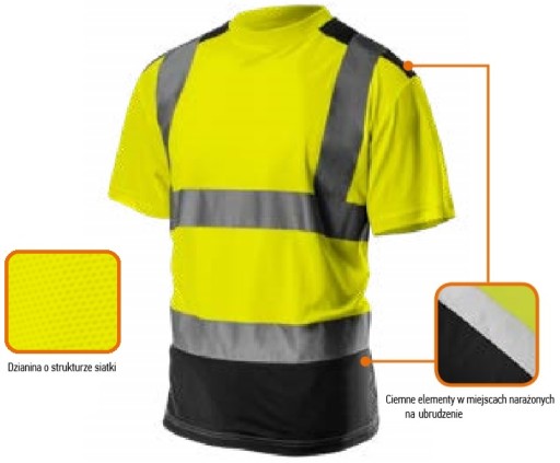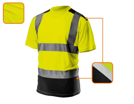 T-shirt roboczy ostrzegawczy NEO o intensywnej widzialności to praktyczne rozwiązanie zwiększające bezpieczeństwo użytkownika, polegające na sygnalizowaniu jego obecności w każdych warunkach oświetlenia dziennego jak i w ciemności w sztucznym oświetleniu np. światłami pojazdów. Zastosowanie przewiewnego i lekkiego materiału zwiększa komfort użytkownika podczas upałów. Ciemne elementy umieszczono w miejscach narażonych na zabrudzenia.