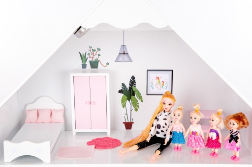 Przepiękny, duży domek dla lalek w całości w kolorze białym. Piękna dekoracja pokoju dziewczynki w stylu skandynawskim.