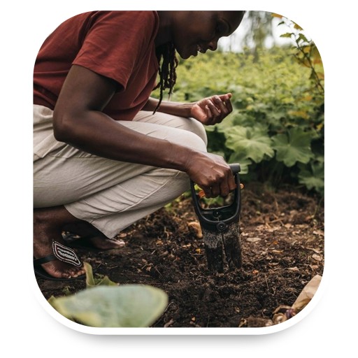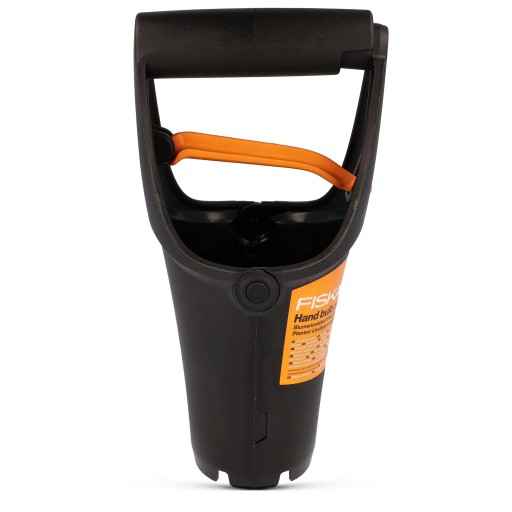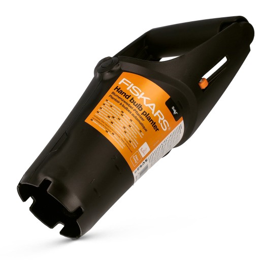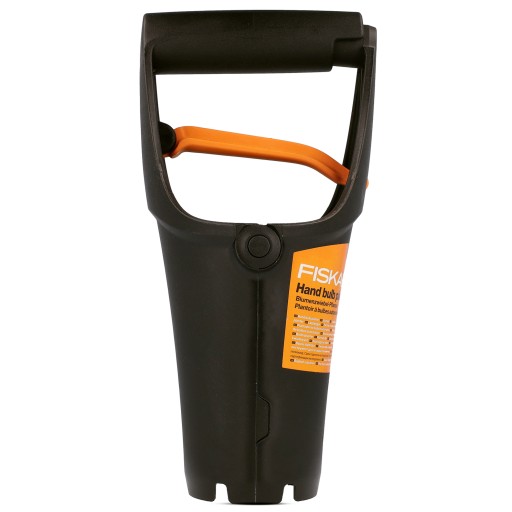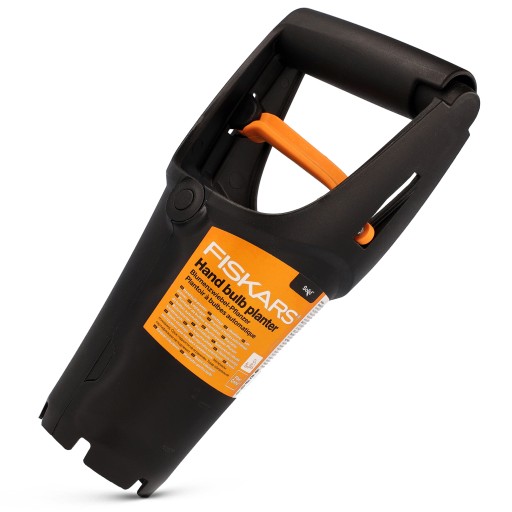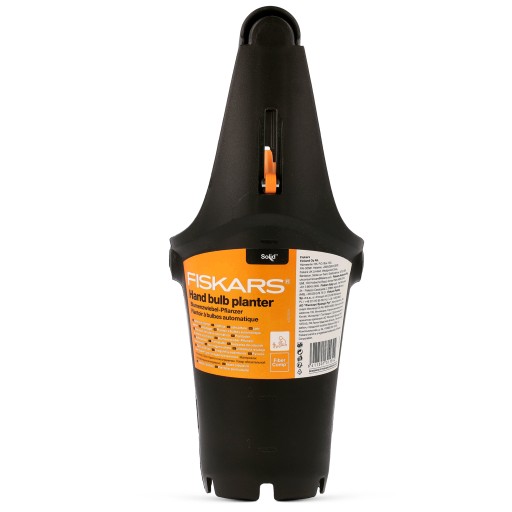 Po naciśnięciu pomarańczowej dźwigni w uchwycie, sadzarka otwiera się i uwalnia glebę, aby zakopać cebulkę w ziemi.