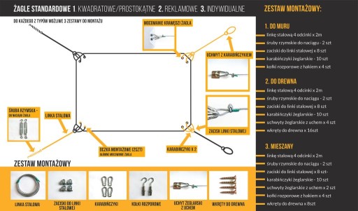 Kompletny, profesjonalny zestaw mieszany dedykowany dla żagli przeciwsłonecznych w kształcie kwadratu i prostokąta.
