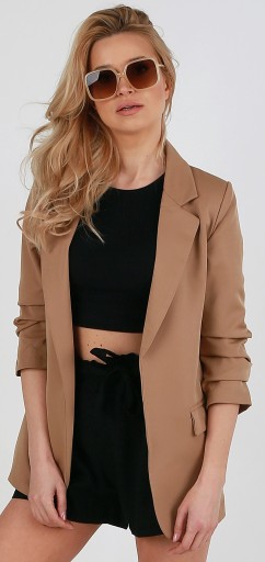 Model dłuższy, smokingowy pasujący do eleganckiego jaki i casualowego stylu. Doskonałe dopełnienie stylizacji do pracy, na uczelnie lub na wieczorne wyjście. Oryginalnego charakteru dodają drapowane rękawy o długości 3/4. Dwie kieszonki po bokach z efektownymi klapami upiększają marynarkę. Fason luźny, z podszewką i miękkimi poduszkami w ramionach.