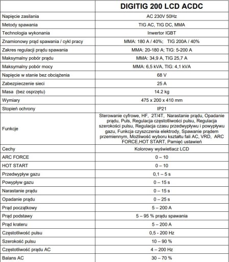DIGITIG 200 LCD ACDC to spawarka ze sterowaniem cyfrowym wykonana w technologii IGBT. Służy do spawania ręcznego prądem stałym i przemiennym stali konstrukcyjnych elektrodami otulonymi (metoda MMA) oraz do spawania elektrodą nietopliwą w osłonie gazu obojętnego (metoda TIG) stali jakościowych i metali kolorowych.