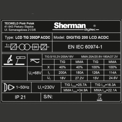 Marka: SHERMAN | Metody spawania: TIG AC/DC, MMA | Zasilanie: 230V | Prąd spawania: 200A | Sprawność: 40%