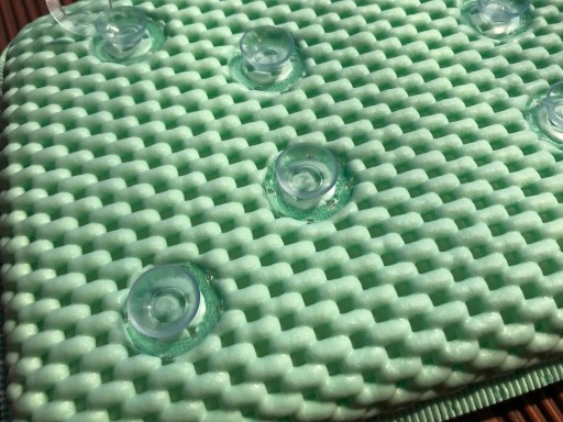 Przylega za pomocą 8 mocnych przyssawek, które zapobiegają zsunięciu się do wody, gdy opieramy głowę.