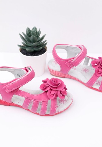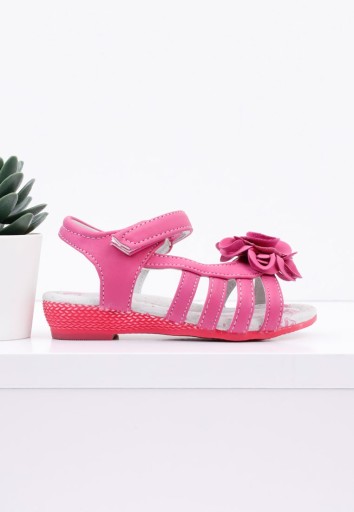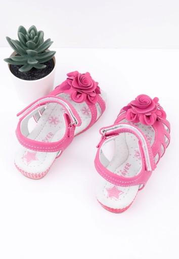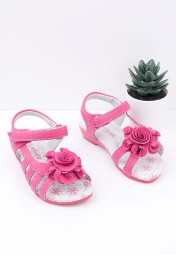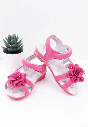 Sandałki dziewczęce, osadzone na lekkim koturnie. Wykonane z ekozamszu,z przodu udelorowane uroczym kwiatuszkiem. Zapisane na wąski paseczek wokół kostki. Super sandałki dla Twojej pociechy.