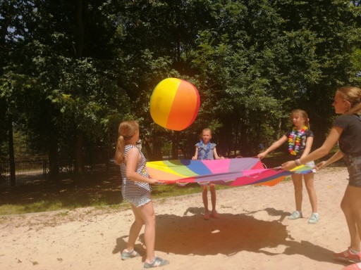 Tęczowa piłka idealnie nadaje się do zabaw w pomieszczeniu jak i na świeżym powietrzu, z wykorzystaniem naszych chust i mat animacyjnych.