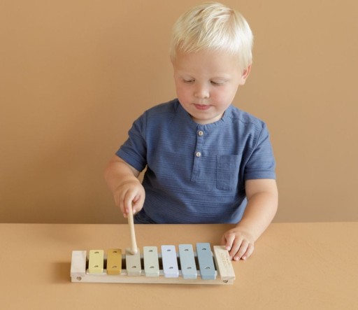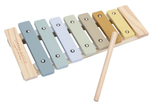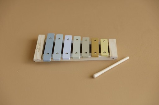Drewniane cymbałki w pastelowych kolorach. Posiadają 7 stopniową skalę, wydają delikatny dźwięk. W zestawie pałeczka do grania.