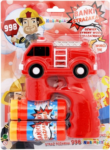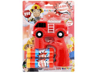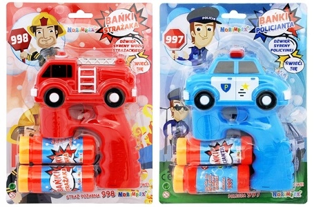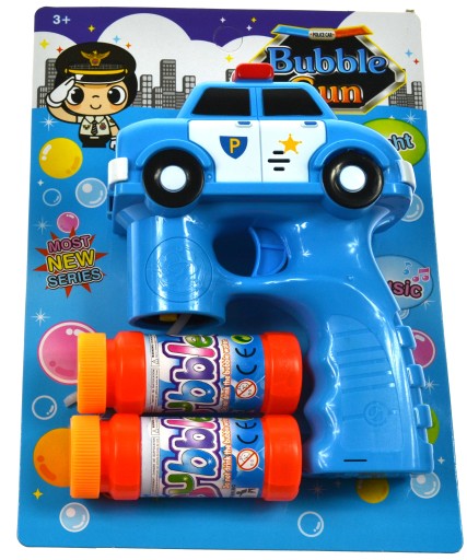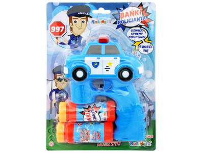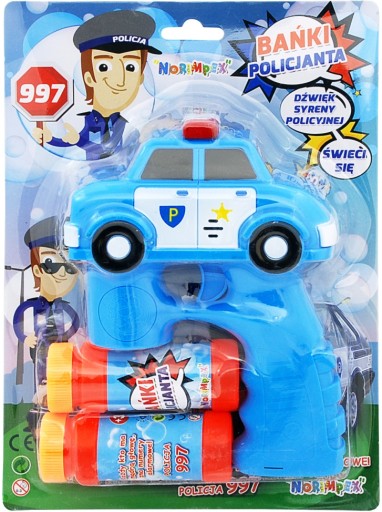Aparat do baniek w formie niebieskiego pistoletu z radiowozem. Zamontuj buteleczkę z płynem i naciśnij kilkukrotnie spust by z pistoletu wystrzelił strumień baniek. Dodatkowo pistolet zacznie świecić i wydawać dźwięk syreny policyjnej. Po skończonej zabawie wystarczy przepłukać zabawkę, by była gotowa do następnego użycia.