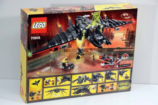 Batwing uniesie Cię wysoko ponad dachy Gotham City. Batwing ma otwierany kokpit z miejscem dla dwóch minifigurek: Batmana i Robina. Jest też wyposażony w obrotowe silniki, skrzydła, które można ustawić w pozycji do lotu albo lądowania, dwa sprężynowe działka i dwa miotacze dysków, a w tylnej części mieści otwieraną ładownię z samochodem.