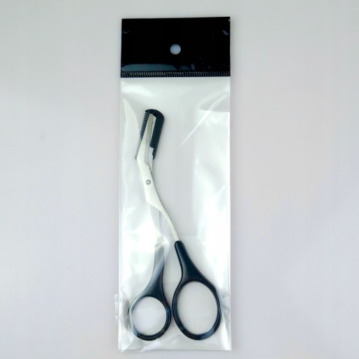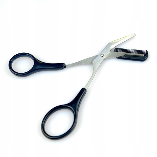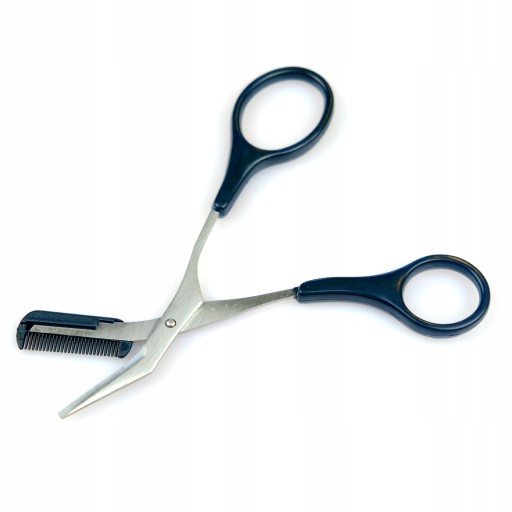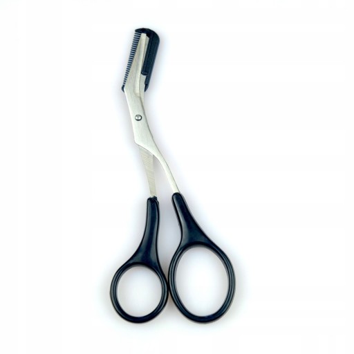 Specjalistyczne precyzyjne nożyczki przeznaczone do przycinania i stylizacji brwi zaopatrzone w grzebyk ułatwiający ułożenie brwi przed ich przycięciem.