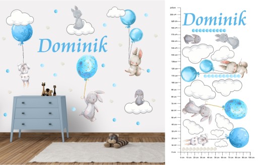 Zestaw naklejek na ścianę z imieniem dziecka. Cały zestaw mieści się na arkuszu o wymiarach 100cm x 210cm.