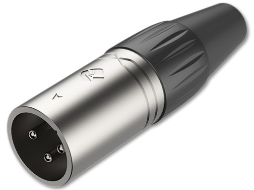 Złącze XLR do montażu na kablu, metalowy korpus, odkręcana zagłuszka zabezpieczająca kabel.