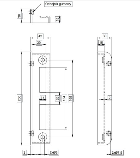 Zaczep do furtek. Możliwość dokręcenia blachowkrętami "farmer". Ma ząbki w podstawie zapobiegające przesuwaniu po dokręceniu. posiada odbojniki gumowe.