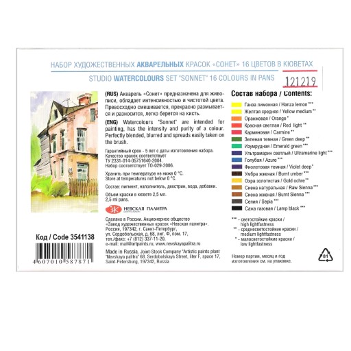 Akwarele Sonnet produkowane są przez fabrykę farb artystycznych Nevskaya Palitra z Petersburga, która już ponad 80 lat zajmuję się wytwarzaniem farb najwyższej jakości, przeznaczonych dla profesjonalnych artystów i miłośników sztuki.