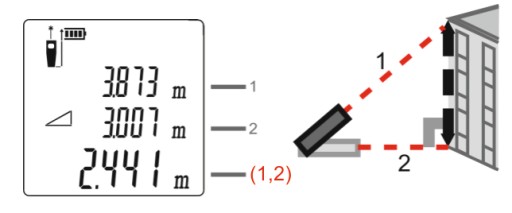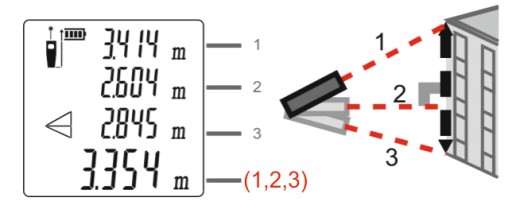 Naciśnij czterokrotnie przycisk wyboru trybu pomiaru, aby aktywować funkcję (na wyświetlaczu pojawi się symbol dwóch trójkątów). Wykonaj trzy pomiary w kolejności jak na rysunku, w efekcie czego wysokość obiektu zostanie przeliczona przez urządzenie automatycznie.