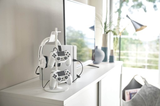 Stojak na Pady i Słuchawki od Yamazaki Home pozwoli przechować Twoje cenne kontrolery Playstation lub Xbox.