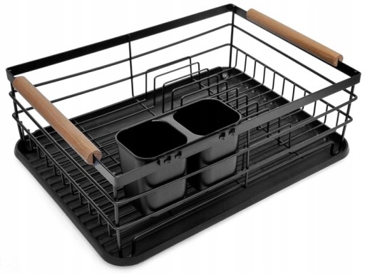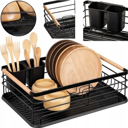 ✅Suszarka do naczyń charakteryzuje się bardzo wysoką jakość i trwałą i metalową konstrukcją. Wykonana z żywicy tacka chroni blat przed zamoczeniem. W zestawie znajduje się również plastikowy, dwukomorowy ociekacz na sztućce. Metalowa czarna suszarka z drewnianymi rączkami jest eleganckim rozwiązaniem do każdej kuchni.