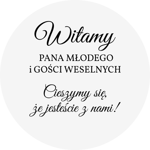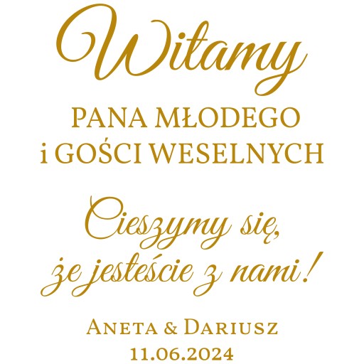 - naklejka składa się z dwóch elementów, tj. 1 element z napisem "Witamy! PANA MŁODEGO i GOŚCI WESELNYCH", 2 element z napisem "Cieszymy się, że jesteście z nami!" i Twoimi imionami i datą