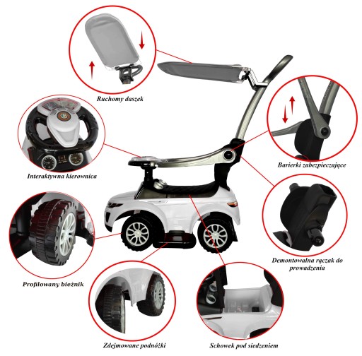 - Opcja 4w1 umożliwiająca używanie pojazdu jako jeździk, chodzik pchacz lub DUŻY SAMOCHÓD do zabawy dla starszego dziecka sprawia, że zabawka ROŚNIE wraz z nim.