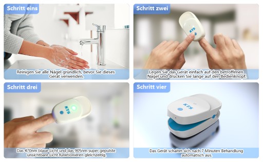 Po prostu umieść urządzenie na dotkniętym paznokciu i długo naciśnij przycisk zasilania, wtedy światło zacznie migać, niebieskie światło i niewidzialne światło superpulsacyjne będą działać w tym samym czasie. To urządzenie wyłączy się automatycznie po 7 minutach leczenia. Proszę używać tego urządzenia codziennie i przynajmniej raz dziennie.