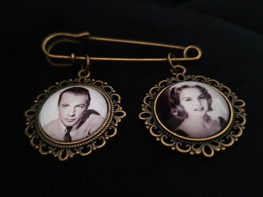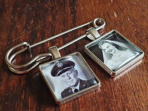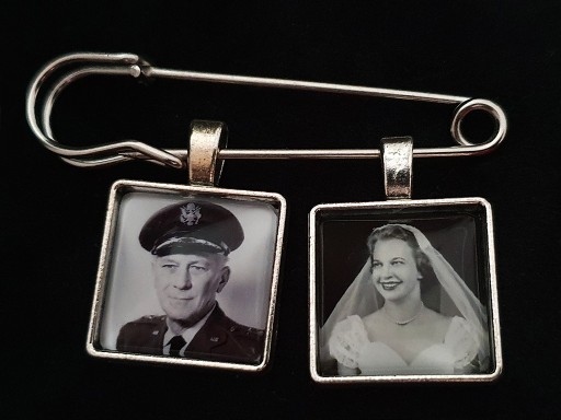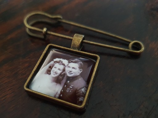 Szklana zawieszka z agrafką do butonierki / bukietu Ślubnego z przesłanym przez Ciebie zdjęciami, grafiką, tekstem.