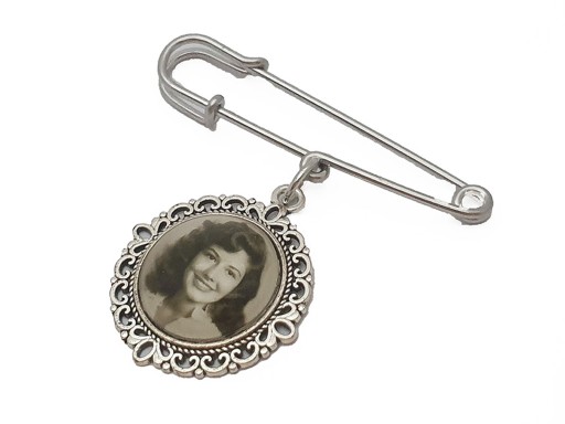 Szklana zawieszka z agrafką do butonierki / bukietu Ślubnego z przesłanym przez Ciebie zdjęciami, grafiką, tekstem.