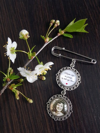 Szklana zawieszka z agrafką do butonierki / bukietu Ślubnego z przesłanym przez Ciebie zdjęciami, grafiką, tekstem.