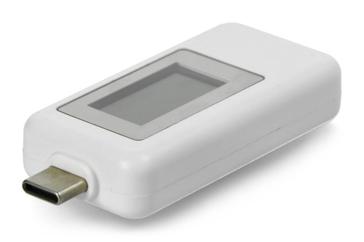 Miernik USB w kolorze białym, przeznaczony jest do testowania gniazd USB typu C. Wyposażony jest w mały, ale czytelny ekran LCD, który wyświetla napięcie, natężenie prądu, pojemność, czas pracy, temperaturę wewnętrzną i moc. Urządzenie wspiera Quick Charge 2.0 i 3.0. Posiada przycisk Reset.