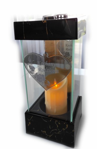 Piękny szklany znicz w kolorze czarnym, zdobiony ręcznie malowaną złotą nicią oraz zawieszką w kształcie serca z napisem "Kochanej Mamie". Na tylnej ścianie znajduje się lustro odbijające światło świecy.