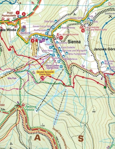 Na mapie zaznaczono informacje przydatne turyście, takie jak zabytki, noclegi, granice obszarów chronionych, szczególnie atrakcyjne miejsca zaznaczono żółtą ramką. W miejscowościach opisano nazwy ulic. Podano aktualne przebiegi szlaków pieszych, rowerowych, narciarskich i konnych, łącznie z kilometrażem co pozwoli łatwiej zaplanować wycieczkę. Przy szlakach pieszych podano także orientacyjny czas przejścia. Zaznaczono wyciągi narciarskie i trasy zjazdowe.